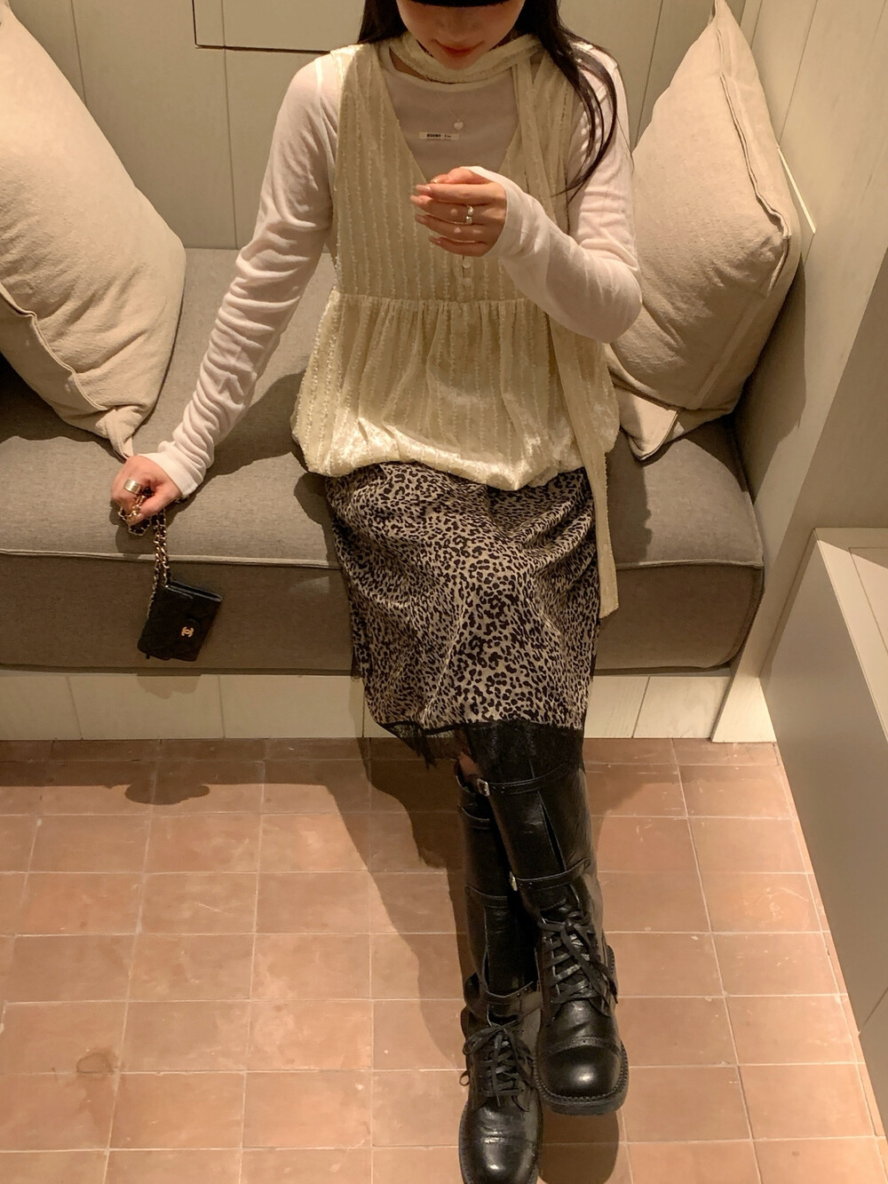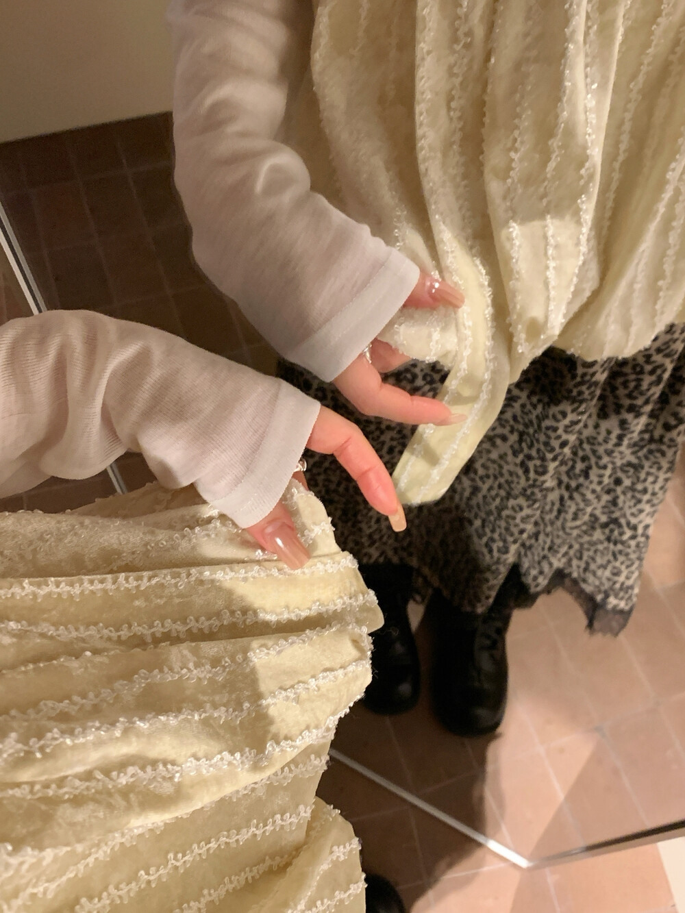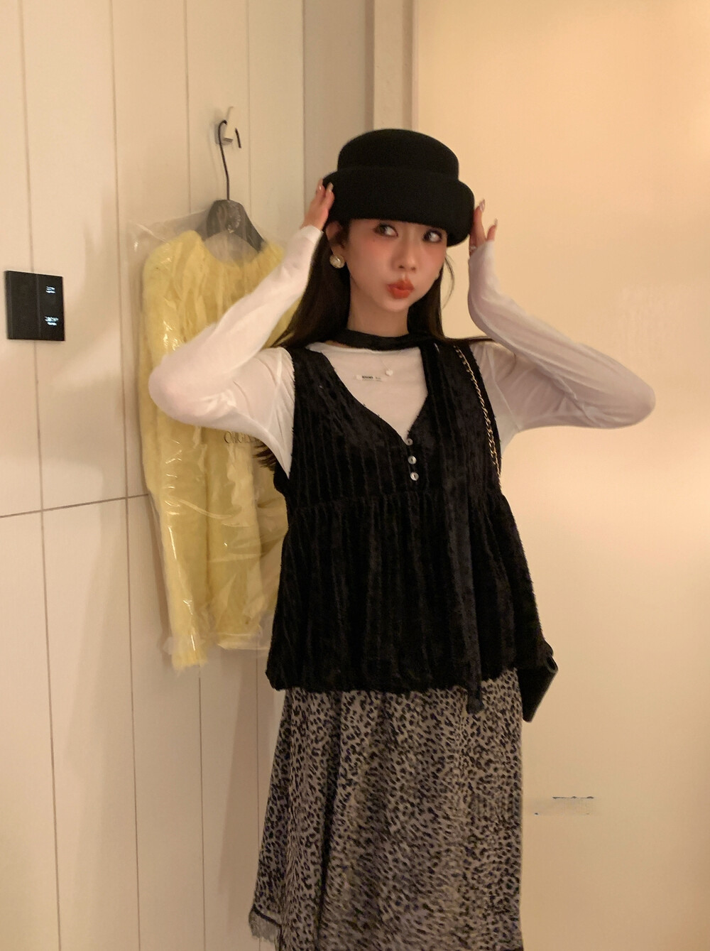 柔らかなニット生地が体にやさしくフィットし、女性らしい落ち着いた印象を演出
